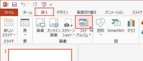 - [挿入]タブの画像グループにある[フォトアルバム]を実行します。