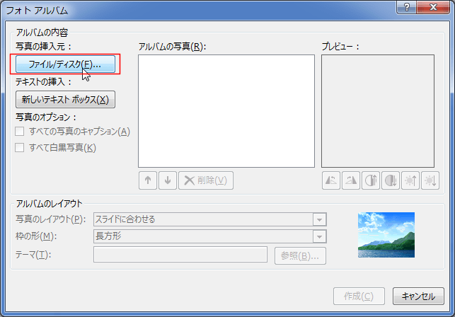 - 写真の挿入元で[ファイル/ディスク]ボタンをクリックします。
