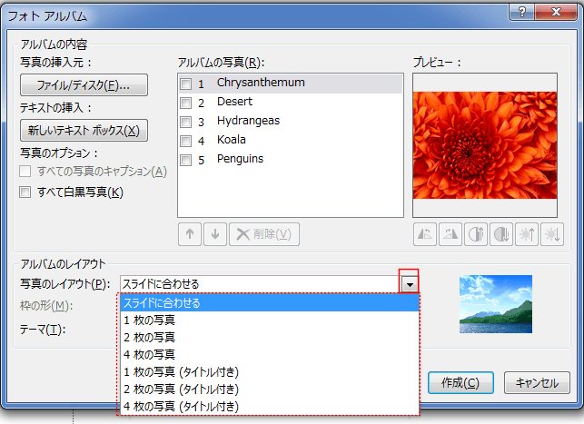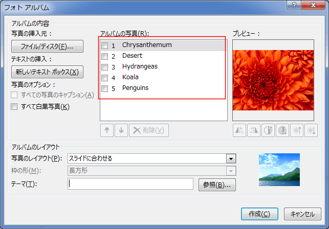 - アルバムの写真に挿入した写真(ファイル)の名前が表示されます。