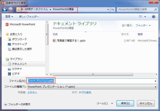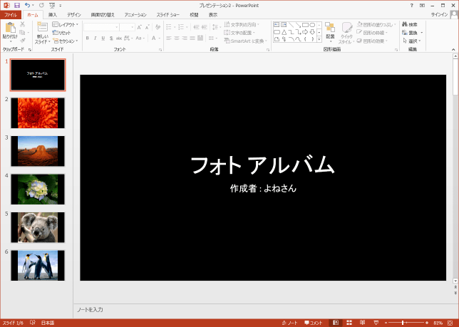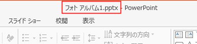 - タイトルバーに設定したファイル名「フォトアルバム1.pptx」と表示されました。