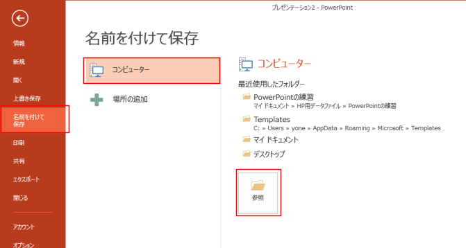 - バックステージビューで、[名前を付けて保存]をクリックします。
