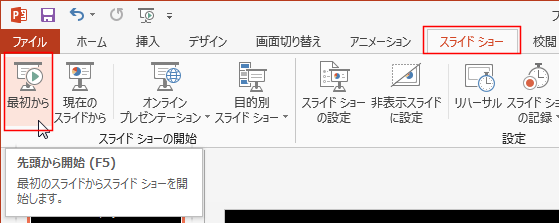 スライドショーの開始グループの[最初から]を実行します。