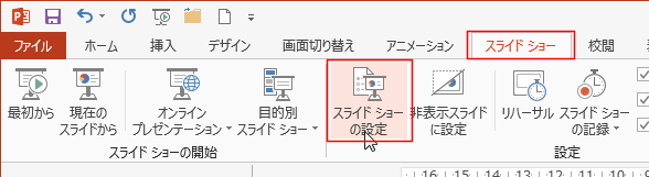 - [スライドショー]タブを選択して、[スライドショーの設定]をクリックします。