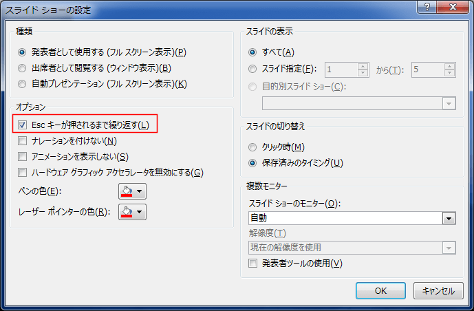 - 「発表者として使用する(フルスクリーン表示)」を選択した状態で、「Escキーが押されるまで繰り返す」にチェックを入れると、[Esc]キーを押すまでプレゼンテーションを実行することができます。
