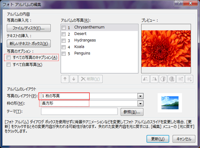 - 「すべての写真のキャプション」にチェックを入れ、[更新]ボタンをクリックします。