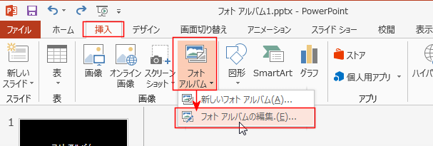 - [挿入]タブの[フォトアルバム]→[フォトアルバムの編集]を選択します。