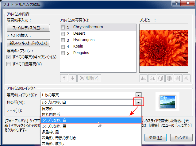- 枠の形で「シンプルな枠、白」を選択して、[更新]ボタンをクリックしました。