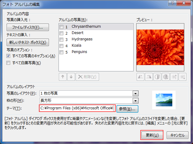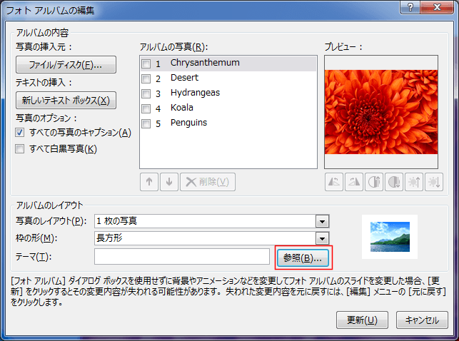 - フォトアルバムのテーマを変更します。