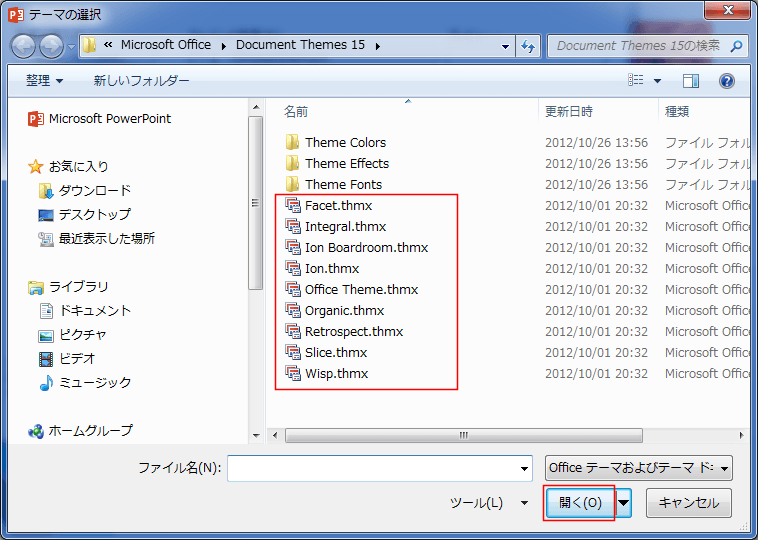 - Windows8の場合: C:\programfiles\Microsoft Office 15\root\Document Themes 15