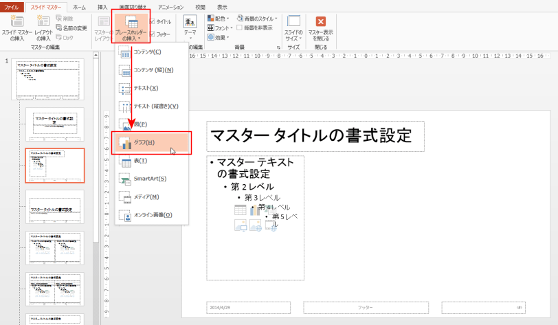 [スライドマスター]タブの[プレースホルダーの挿入]→[グラフ]を選択しました。