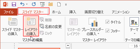- [スライドマスター]タブの[レイアウトの挿入]を実行します。