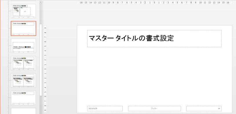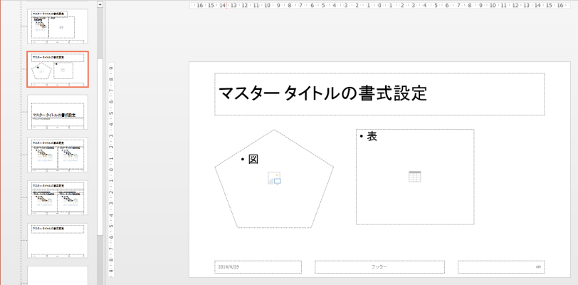 - [スライドマスター]タブの[マスター表示を閉じる]をクリックして、スライドの編集画面に戻ります。