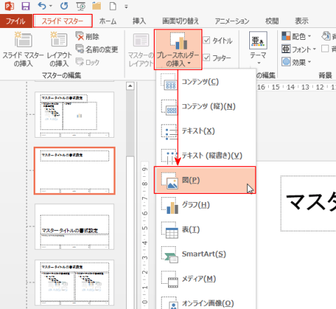 - [スライドマスター]タブの[プレースホルダーの挿入]から「図」や[グラフ]などを挿入して新たなレイアウトを作成します。