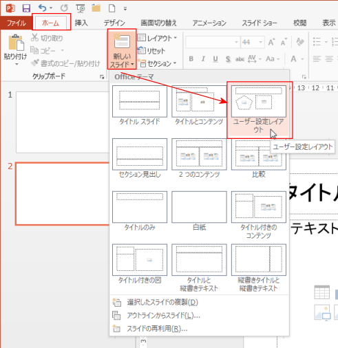 - [ホーム]タブの[新しいスライド]をクリックすると、リストに「ユーザー設定レイアウト」が追加されています。