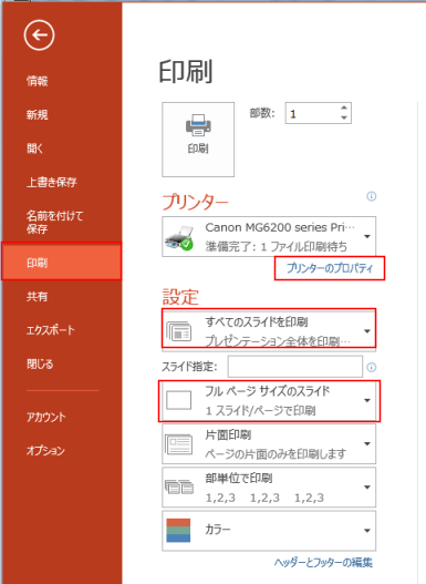 - 「すべてのスライドを印刷」と「フルページサイズのスライド」を選択します。