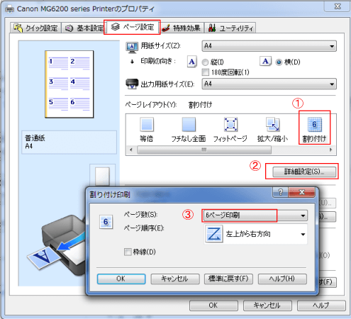 - ここでは、Canon MG6200シリーズのプリンターの例です。使用するプリンターによって画面が異なります。
