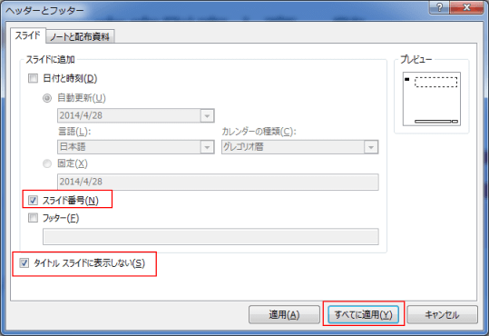 この方はでスライド番号を表示する方法と同じ操作手順です。