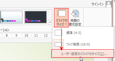 - [デザイン]タブの[スライドのサイズ]→[ユーザー設定のスライドのサイズ]をクリックします。