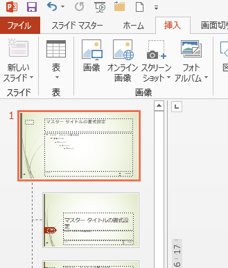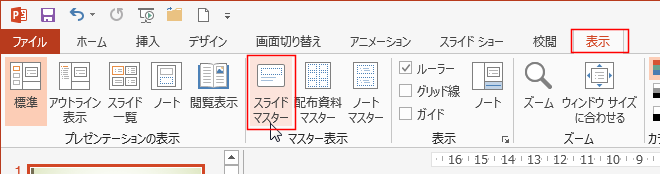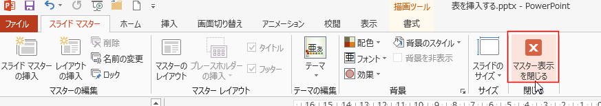 - [スライドマスター]タブの[マスター表示を閉じる]で編集画面に戻ります。