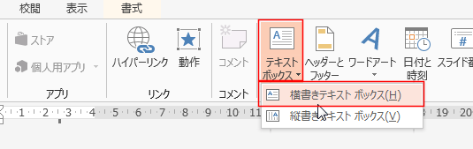 - [挿入]タブの[テキストボックス]→[横書きテキストボックス]を選択します。