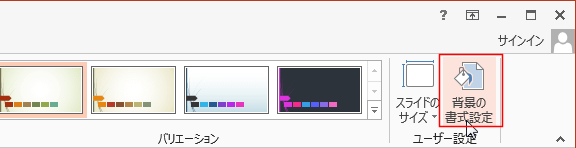- [デザイン]タブのユーザー設定グループにある[背景の書式設定]を実行します。