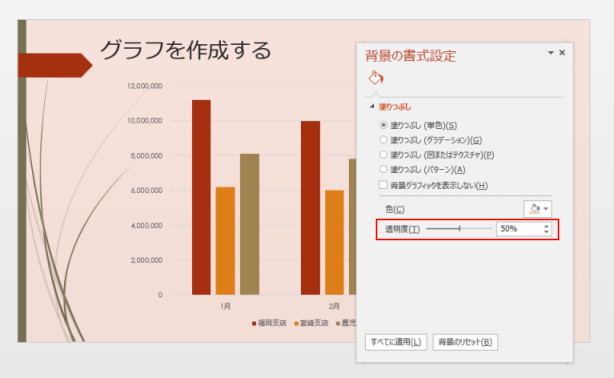 - 画面の右端に「背景の書式設定」ウィンドウが表示されます。