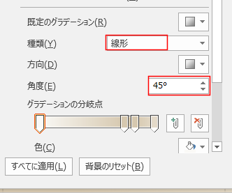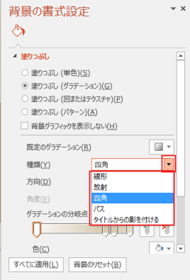 - 種類ではグラデーションの種類を「線形、放射、四角、パス、タイトルからの影を付ける」から選択できます。