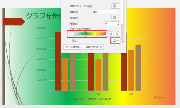 - グラデーションの分岐点では分岐する位置と色を設定することができます。