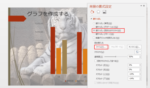 図の挿入で[ファイル]ボタンをクリックして、画像を背景にすることができます。