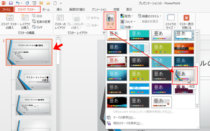 [スライドマスター]タブの[デーマ]→[視差]を選択しました。