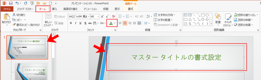マスタータイトルの書式設定 を選択して、[ホーム]タブのフォントグループの[フォントの色]で緑色に設定しました。