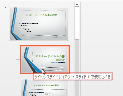 - スライドレイアウトをポイントする(マウスポインタを重ねる)と「スライド1で使用される」と表示されます。
