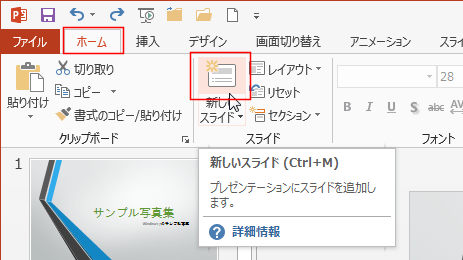 - [ホーム]タブの[新しいスライド]を2回クリックして、スライドを2枚追加しました。