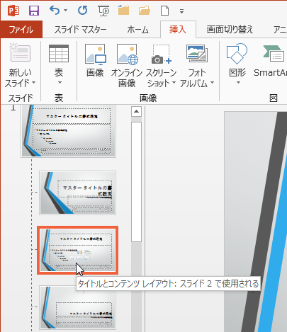 - 左側にスライドのレイアウトで、「スライド2で使用される」レイアウトを選択します。