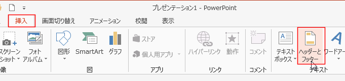 - [挿入]タブの[ヘッダーとフッター]を実行します。