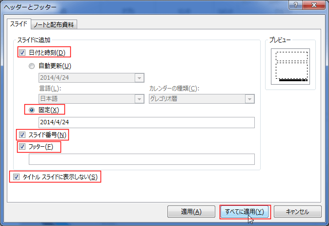 さらに、「スライド番号」「フッター」「タイトルスライドに表示しない」にもチェックを入れました。