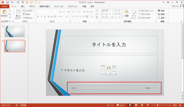 - スライドにヘッダーとフッターが表示されました。