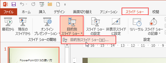 - [スライドショー]タブの[目的別スライドショー]→[目的別スライドショー]を実行します。