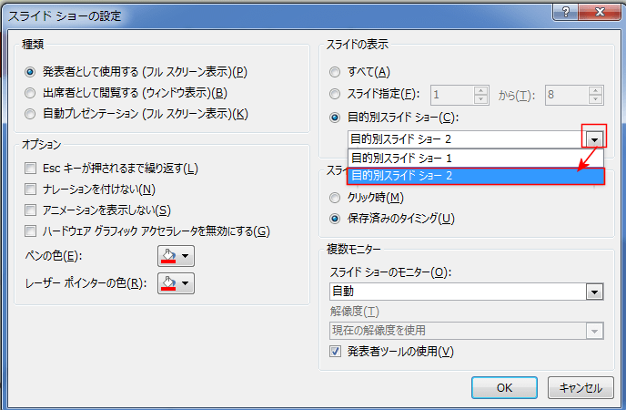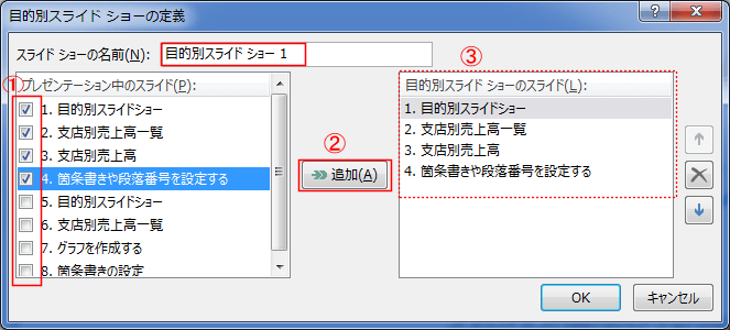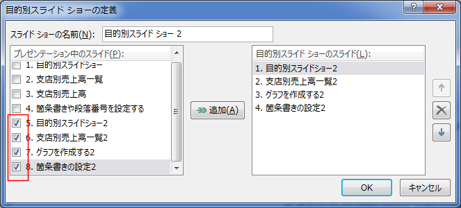 - 「目的別スライドショー」にチェックを入れて、選択します。