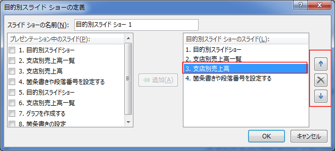 - プレゼンテーションの目的に応じて、使用するスライドを選択したり、スライドの表示順番を入れ替えたりして、目的別に編成することができます。