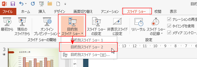 - [スライドショー]タブの[目的別スライドショー]→[目的別スライドショー2]を選択すると、[目的別スライドショー2]のスライドショーが実行されます。