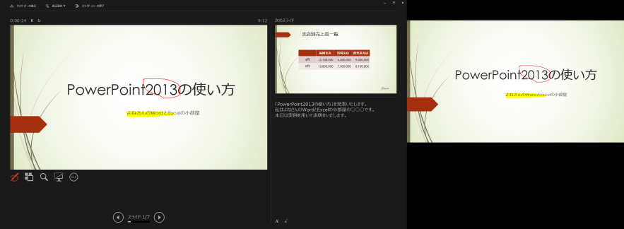 - 発表者ツールを使うことで、手前のPC画面にはノートを表示して見ながら発表(プレゼンテーション)ができます。