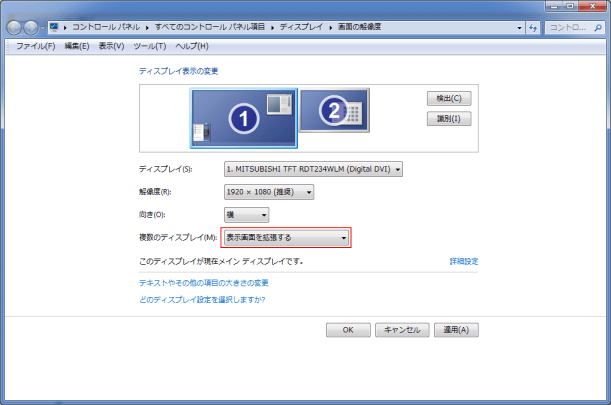 - 複数のディスプレイで「表示画面を拡張する」を選択します。