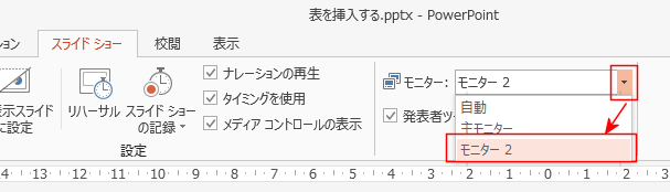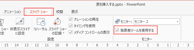 - [スライドショー]タブで「発表者ツールを使用する」にチェックを入れます。
