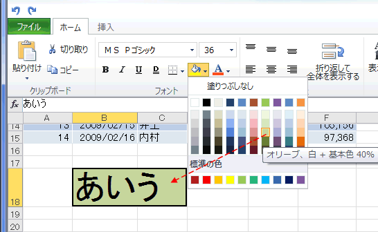 [塗りつぶしの色]、[フォントの色]はプレビュー機能が備わっています。