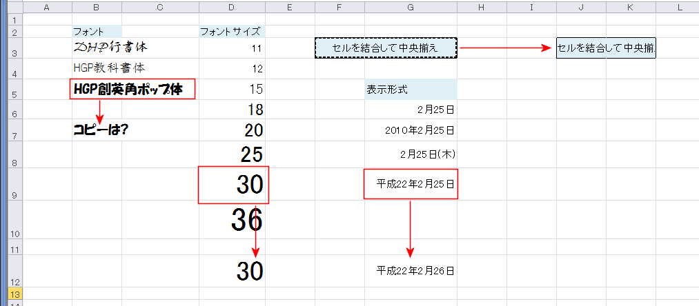 下図はフォントの種類やサイズ、表示形式、セルを結合して中央揃えの例です。