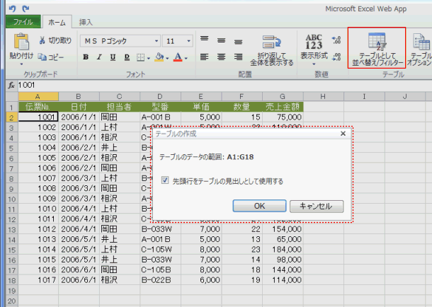 [ホーム]タブの[テーブル]グループに[テーブルとして並べ替え/フィルター]コマンドがあります。