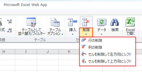 [削除]では、行・列・セルの削除が可能です。
