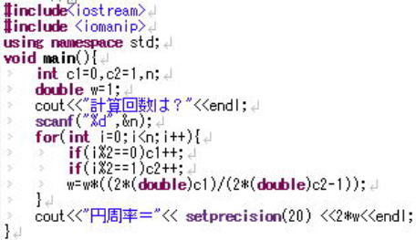 ウォレスの公式によって円周率πを求めるプログラムコード例