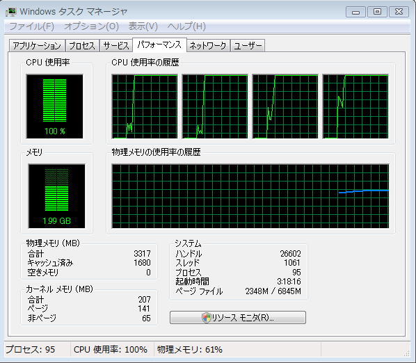 CPU使用率が100%になっている状態を最初に見て頂きましょう。